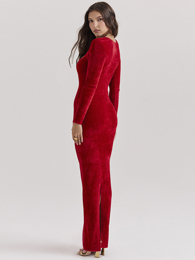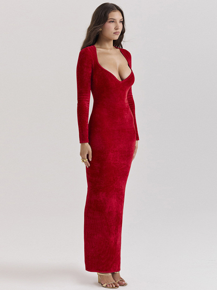 Velvet Long Sleeve Maxi Dress For Women Elegant V Neck Back Slit Bodycon Club Party Dress Clubwear Dresses