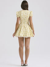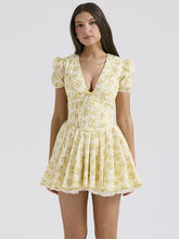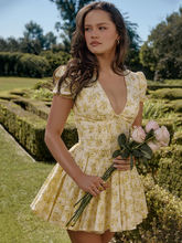 Vintage Print Mini Dress For Women Summer Yellow Short Sleeve Deep V Neck A-line Pleated Dress Elegant 2024