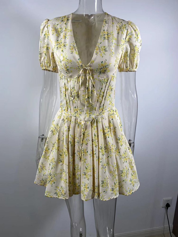 Vintage Print Mini Dress For Women Summer Yellow Short Sleeve Deep V Neck A-line Pleated Dress Elegant 2024