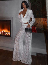 White Lace Two Piece Sets Women Deep V Neck Long Sleeve Tops And Long Pants Ladies See Through Loose Trousers Sets