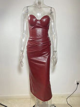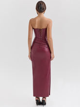 Wine Red Strapless PU Leather Maxi Dress Women Off-shoulder Backless Lace-up Bodycon Club Party Long Dress