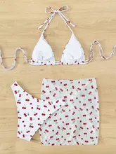 With Mesh Sarong Skirt Cherry Printed Bikini Female Swimsuit Women Swimwear Three Pieces Bikini Set Bathing Suit Swim Beachwear