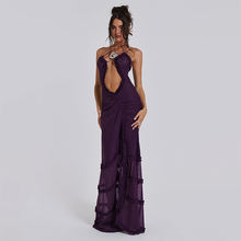 Women Noble Furry Halter Sleeveless Hollow Dress Camisole Shrunk Split Wave Cut Dress Luxury Prom Occasion Evening Gown