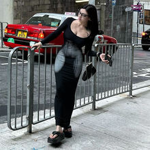 Women Square Collar Long Sleeve Dress High Waist Abstract Stripe Body Print Dress Casual Wrap Hipster Mermaid Dres