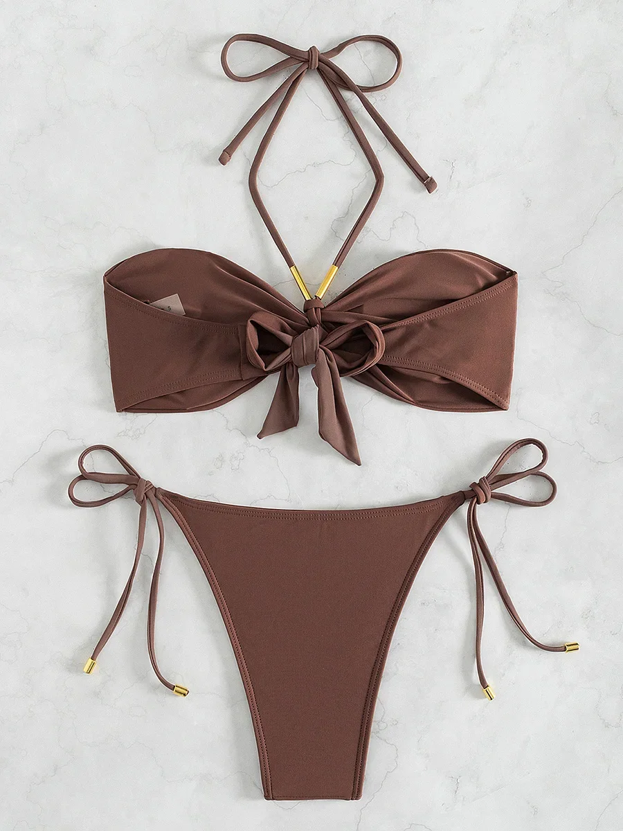 XS – L Halter Wrinkled Bandeau Bikini Female Swimsuit Women Swimwear Two-pieces Bikini Set High Cut Bather Bathing Suit Swim
